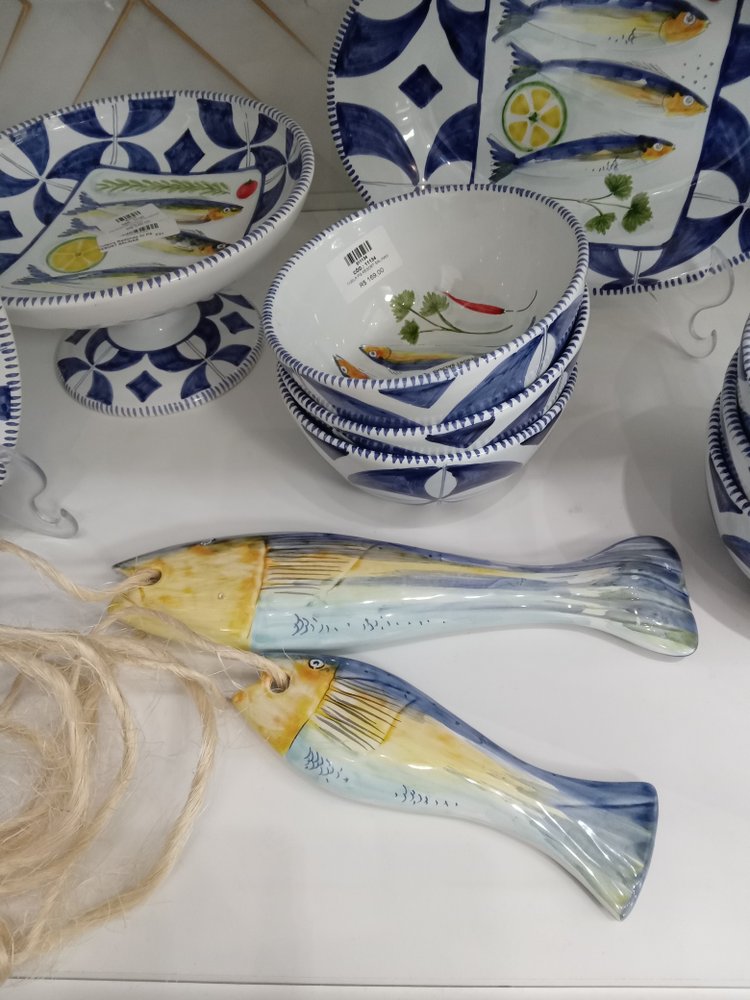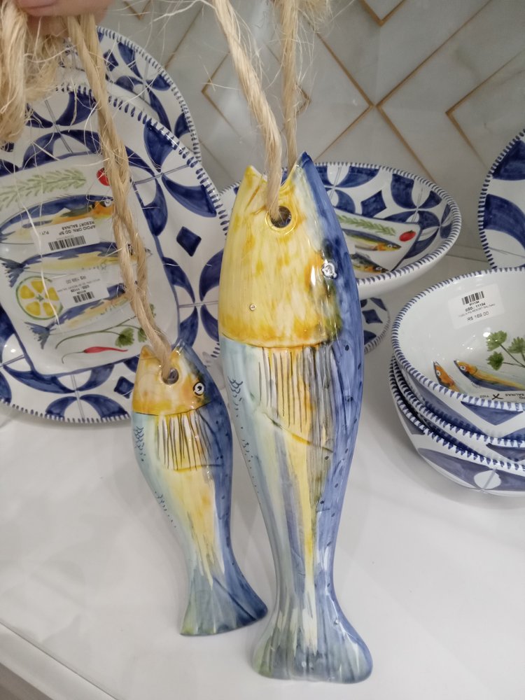 A escultura é composta por dois peixes sardinha (um menor e um maior), detalhados e pintados com a maestria que é a marca da Luiz Salvador. Os peixes são conectados por uma corda de sisal, ideal para pendurar e decorar paredes em ambientes como cozinhas, varandas gourmet, churrasqueiras ou salas com tema praiano.