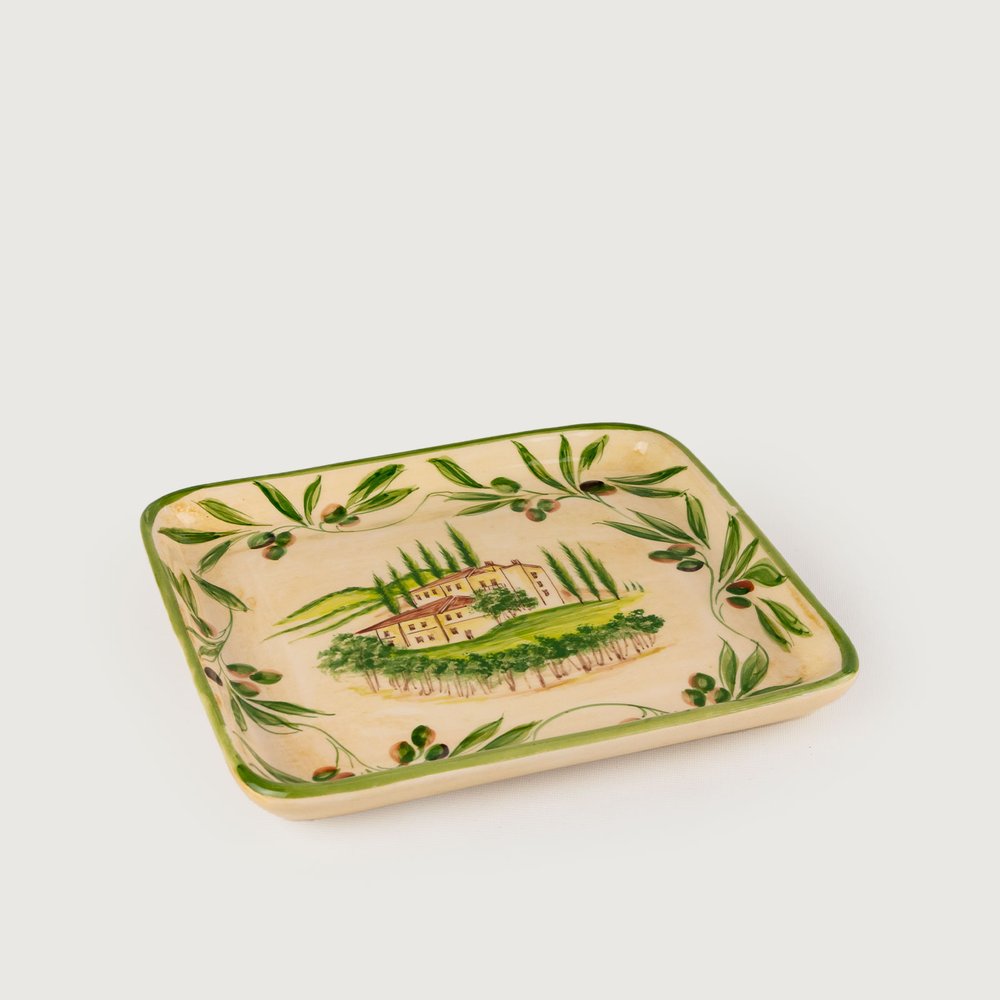 O design celebra o tema Oliveiras, trazendo em sua superfície uma delicada cena campestre, perfeitamente emoldurada. Ideal para servir petiscos, aperitivos ou xícaras de café, ela confere um toque de sofisticação rústica e afetiva à sua mesa ou aparador.