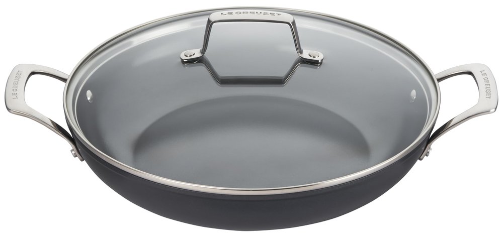 A Caçarola Baixa de 30cm da linha Non-Stick Cerâmica Essential Le Creuset é o equilíbrio definitivo entre a inovação tecnológica e o design funcional. Projetada para ser o item mais versátil da cozinha contemporânea, esta peça combina a rapidez do aquecimento do alumínio forjado com o revestimento antiaderente mais resistente da marca. Sua estrutura ampla e bordas baixas são ideais para preparar desde risotos e paellas até selar carnes ou finalizar pratos no forno, oferecendo uma experiência culinária fluida onde os alimentos deslizam com facilidade e a limpeza se torna uma tarefa simples e rápida.