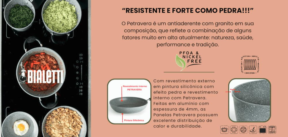 Cozinha Sem Óleo: Com a tecnologia antiaderente Petravera, você pode cozinhar com confiança, sabendo que seus alimentos não grudarão nas panelas. Reduza o uso de óleo e desfrute de refeições mais saudáveis ??e leves.