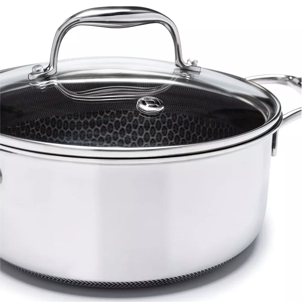 A Caçarola Hive de 24 cm da Oxford é o equilíbrio perfeito entre a durabilidade eterna do aço inoxidável e a modernidade da tecnologia antiaderente. Seu grande diferencial é o fundo com textura em colmeia (tecnologia Hive), que cria um relevo protetor sobre a camada antiaderente, permitindo o uso de utensílios de metal sem comprometer a performance da peça. Com um diâmetro de 24 cm, ela é ideal para o preparo de grandes porções, ensopados e cozidos lentos, garantindo uma distribuição de calor rápida e uniforme graças à sua construção premium.