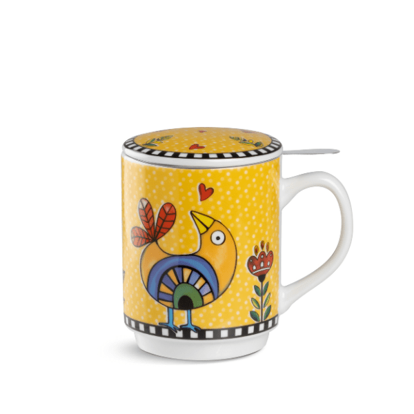 A Caneca para Chá Cocoricò da Egan Italy é um convite ao bem-estar e ao relaxamento. Com uma tonalidade amarela vibrante e ilustrações inspiradas no universo rústico e encantador da linha Cocoricò, esta peça une a praticidade do infusor em aço inoxidável à elegância da porcelana italiana. Desenvolvida para quem não abre mão do ritual do chá, ela permite o preparo direto no recipiente, mantendo a temperatura ideal e preservando todos os aromas da infusão, enquanto adiciona um toque de personalidade e cor à rotina.
