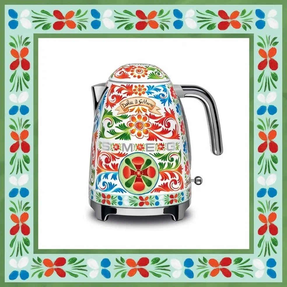A Chaleira Elétrica Smeg x Dolce & Gabbana (Modelo KLF03DGEU) é uma obra de arte funcional, resultado da exclusiva colaboração "Sicily is my Love". Este aparelho combina a alta tecnologia e o design retrô da Smeg com os exuberantes padrões decorativos da Dolce & Gabbana, inspirados nas pinturas de carroças sicilianas e nas cerâmicas majólicas.