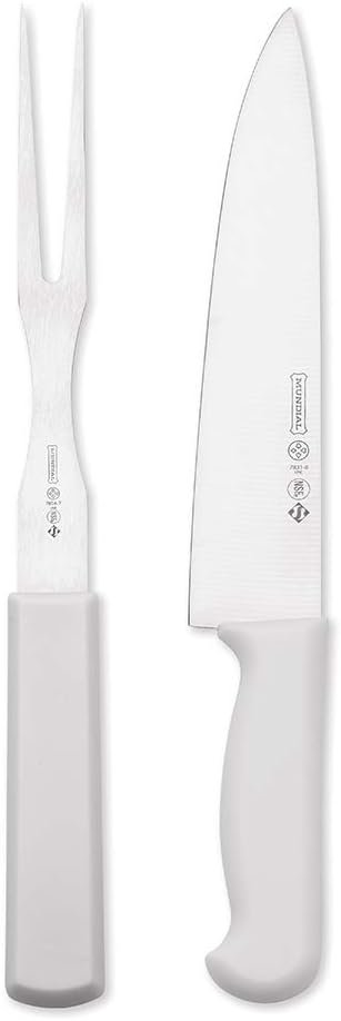 Este conjunto de duas peças é produzido com lâmina temperada em aço inox, que garante maior resistência, sem sofrer danos durante as afiações. O cabo, feito de resina termoplástica e polipropileno, é altamente resistente ao uso diário e oferece uma pegada firme e confortável. O conjunto inclui uma Faca para Carne de 8 polegadas, ideal para cortar carnes cruas, assadas e cozidas, e um Garfo de 7 polegadas, indicado para dar apoio ao alimento durante o corte, garantindo precisão e segurança.