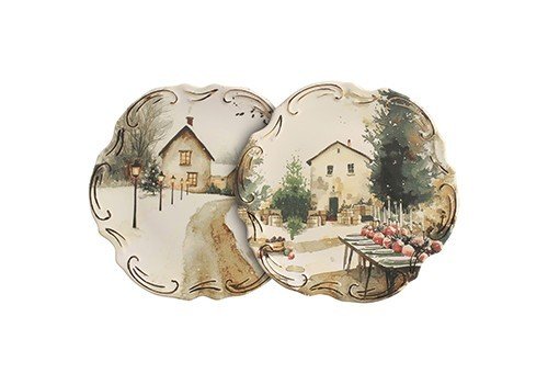 Com 26 cm de largura e 2,5 cm de altura, o conjunto é composto por 6 unidades de pratos rasos. Um diferencial desta coleção é que os pratos são estampados com tema natalino, apresentando 2 estampas diferentes dentro do conjunto, permitindo uma composição dinâmica e charmosa à mesa.