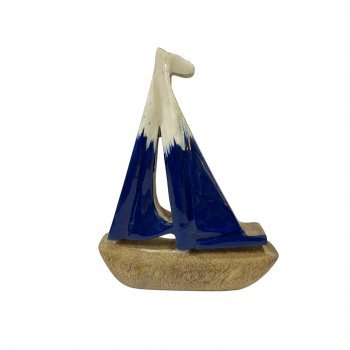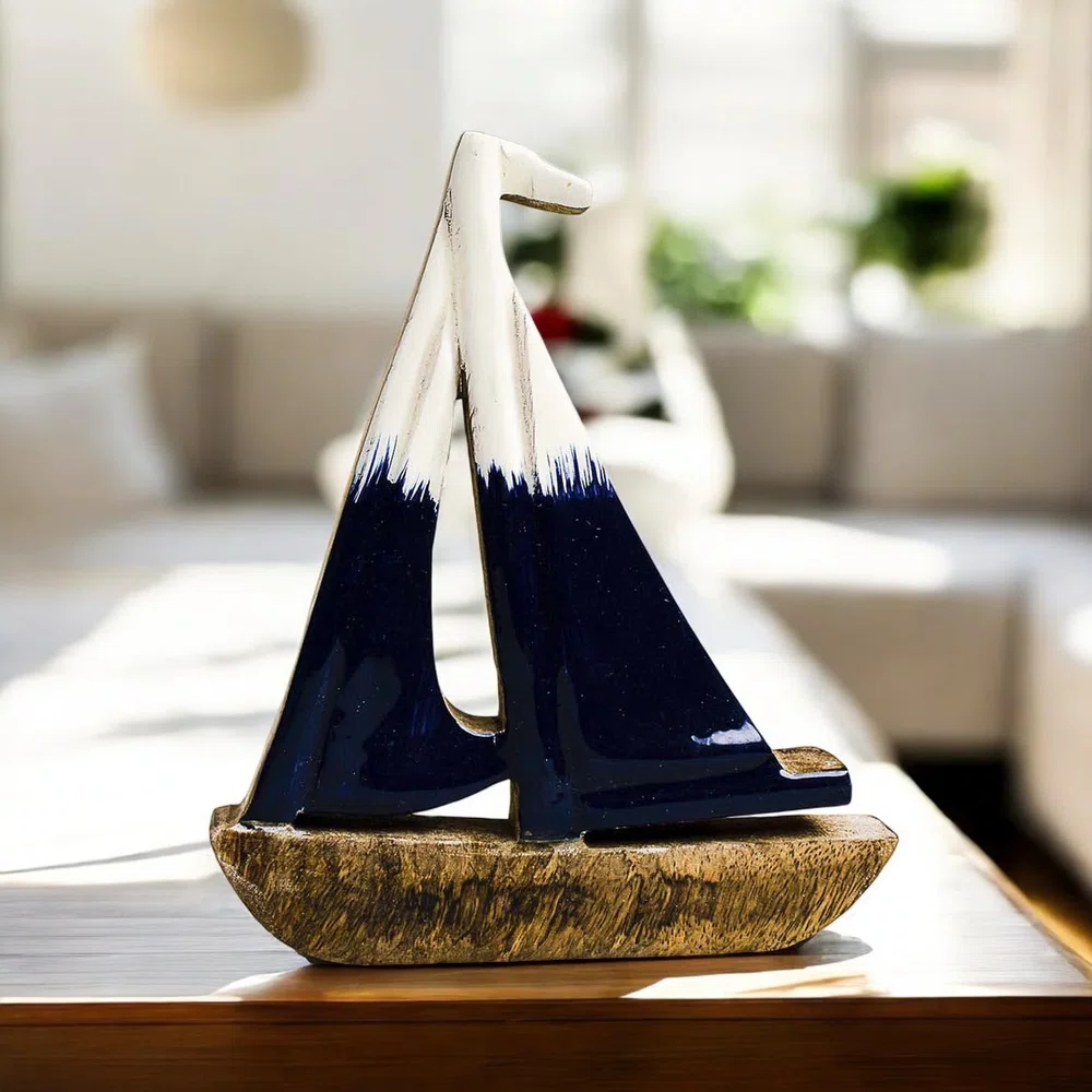 Confeccionado em madeira, o veleiro apresenta as cores clássicas do tema marítimo: Branco e Azul. Seu design delicado, com dimensões compactas, permite que seja facilmente inserido em prateleiras, mesas de centro, estantes ou aparadores, complementando a decoração de salas, quartos ou áreas de lazer.