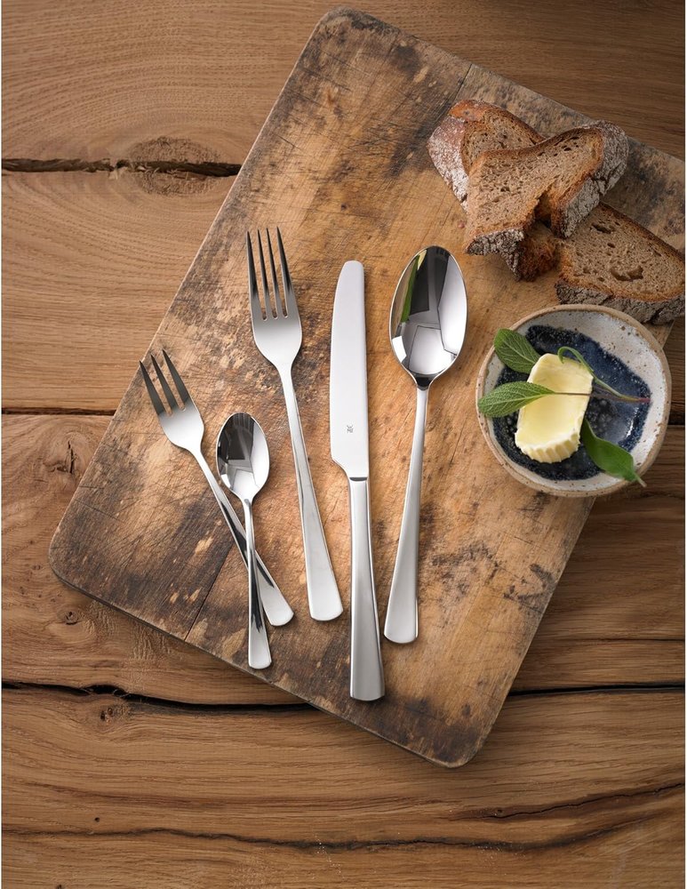 O Faqueiro Denver da WMF é a expressão máxima do design funcional aliado à sofisticação alemã. Composto por 60 peças, este conjunto destaca-se pelas suas linhas retas e superfícies polidas, que conferem uma estética contemporânea a qualquer composição de mesa. Produzido em aço inoxidável Cromargan de alta qualidade, cada talher é projetado para oferecer um equilíbrio perfeito nas mãos, transformando o ato de servir em uma experiência tátil refinada e duradoura.