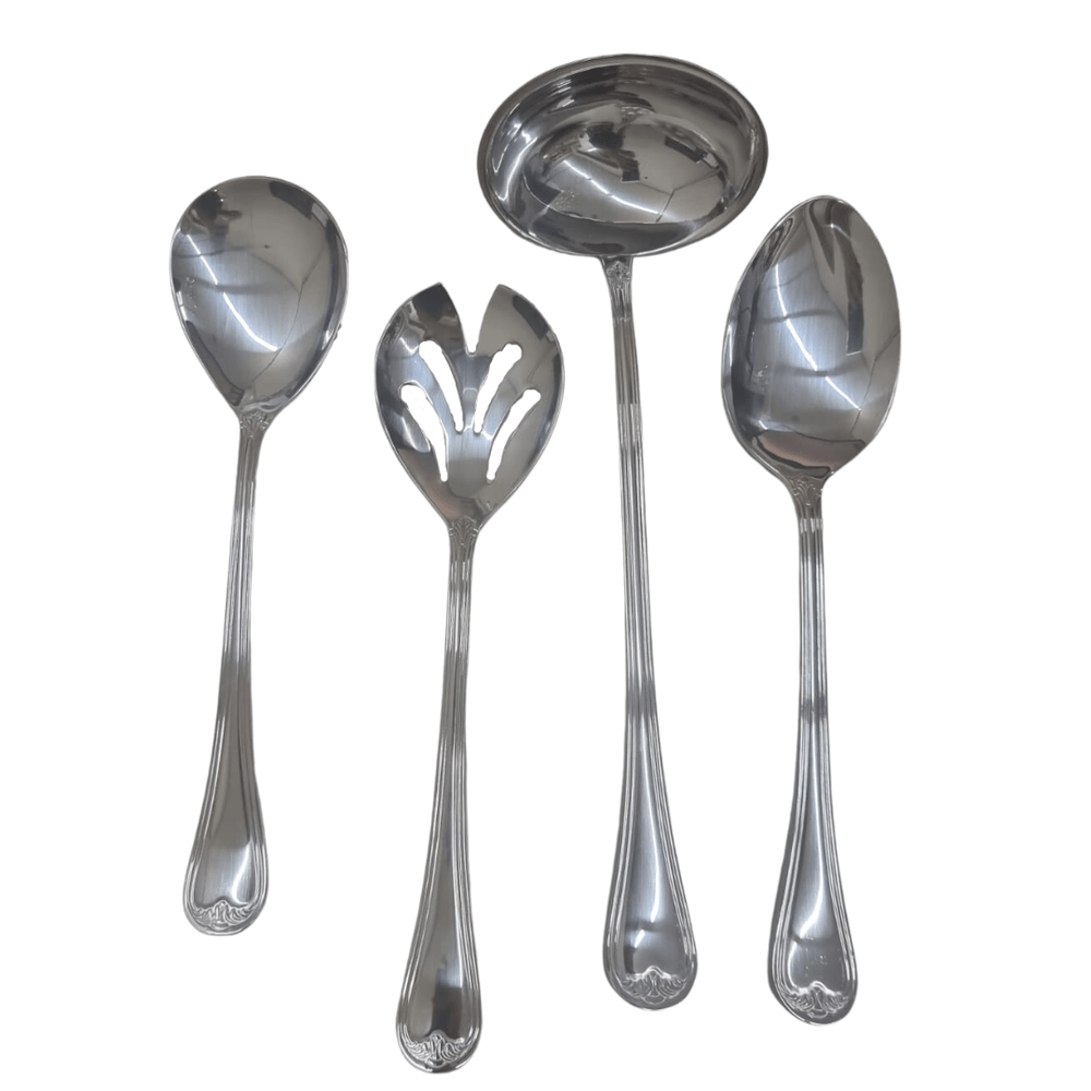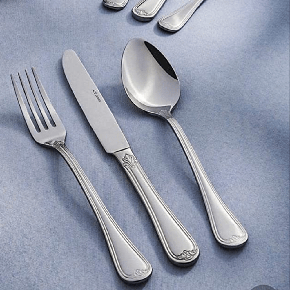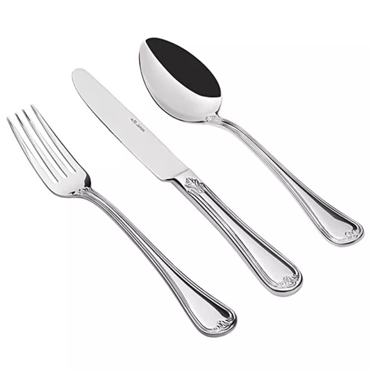 O Faqueiro Versailles da St. James é o epítome do luxo clássico, inspirado na riqueza ornamental do Palácio de Versalhes. Este conjunto completo de 101 peças é ideal para mesas que exigem um toque de opulência e tradição. Fabricado em aço inoxidável 18/10 de alta durabilidade, o modelo Versailles se destaca pelos detalhes elaborados e a rica decoração nas extremidades dos cabos, conferindo um brilho espelhado e uma presença imponente a cada talher.