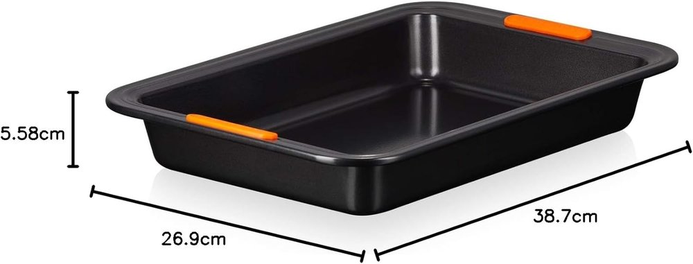A Forma Retangular Funda Para bolo da linha Metal Bakeware Le Creuset, é perfeita para receitas de confeitaria deliciosas. Possui um inovador revestimento sem PFOA e garante fácil limpeza. Seu material compõe aço carbono de grande calibre e fornece condução de calor superior. Leve e durável, obtém abas largas com alças de silicone resistentes ao calor que facilitam a transferência do forno quente para a superfície.