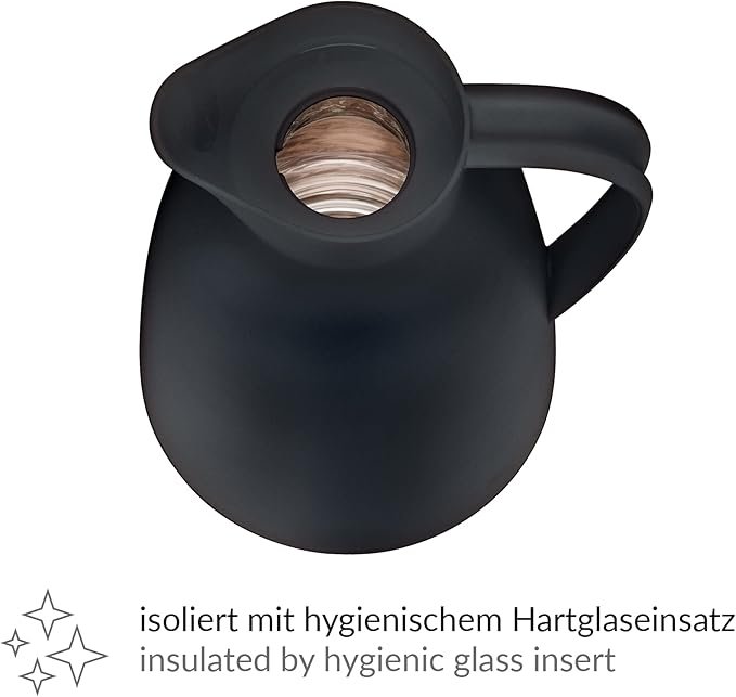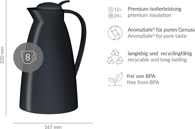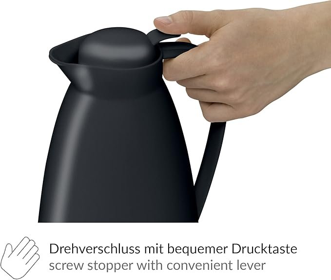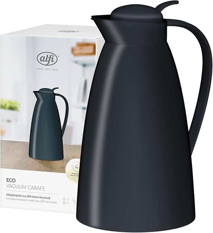 Garrafa térmica de 1L. Desenhadas pelo design: Martin Hauenstein. Seu corpo é feito de polipropileno injetado fosco muito fácil de limpar. Parede interna dupla com revestimento de vidro temperado (AlfiDur) e banho de espelho. Desta forma, mantém a temperatura interna por 12hs para quente e até 24hs para frio. Para facilitar seu uso, o sistema de fechamento é o prático Easy, ou seja, basta apertar o botão que ela abre e fecha hermeticamente, evitando a perda de temperatura. Pode ser usada com apenas uma das mãos.