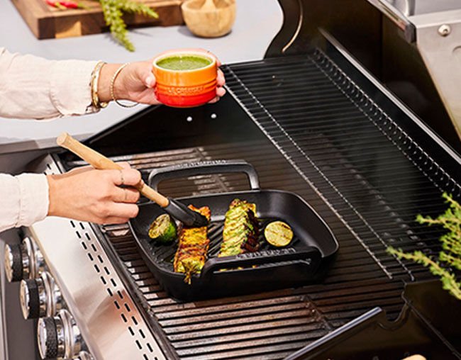 A Grelha Quadrada com Alças de 26cm da linha Alpine Le Creuset em Matte Black é a união definitiva entre a robustez industrial e a sofisticação gastronômica. Projetada especificamente para dominar o calor intenso de chamas abertas, churrasqueiras e fornos de alta temperatura, esta peça eleva o conceito de grelhar a um patamar profissional. Sua superfície quadrada otimiza o espaço de cozimento, permitindo selar proteínas e vegetais simultaneamente, enquanto as ranhuras proeminentes garantem as marcas de grelha perfeitas e a drenagem ideal do excesso de gordura, resultando em pratos com texturas impecáveis e sabor acentuado.
