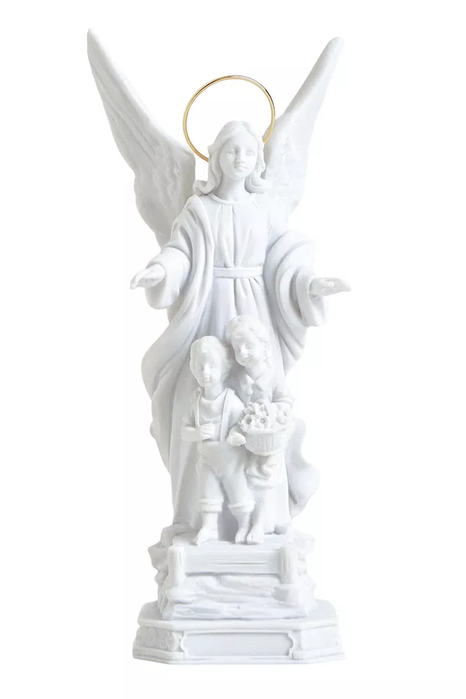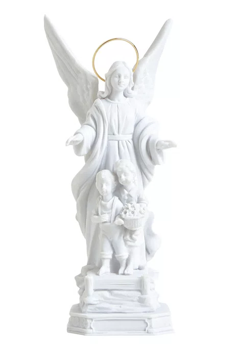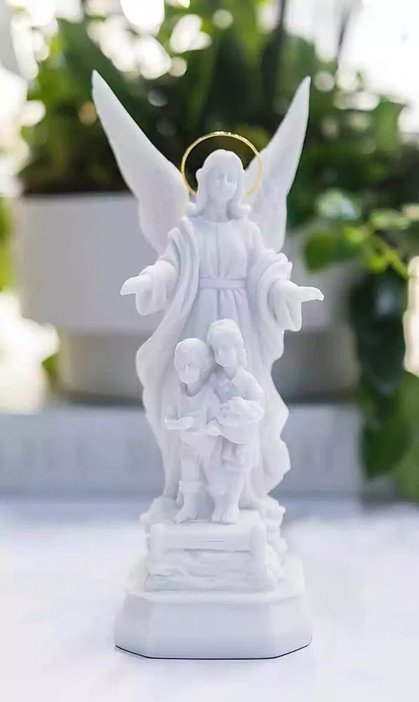 Proteção e Pureza: Escultura do Anjo da Guarda em Pó de Mármore Branco, um Símbolo de Cuidado Celestial.
