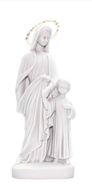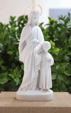 Design de Devoção: A escultura é inspirada na representação da Mãe Maria em seu papel de intercessora e guia, com pose acolhedora e piedosa.