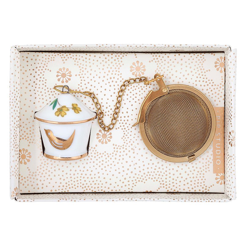 O infusor de chá da Early Bird vem embalado em uma caixa com aproximadamente 4x13x8cm. A casinha é feita em porcelana e tem aproximadamente 4x3cm. A parte redonda, onde o chá é colocado, é feita em inox e mede aproximadamente 5x5cm.
