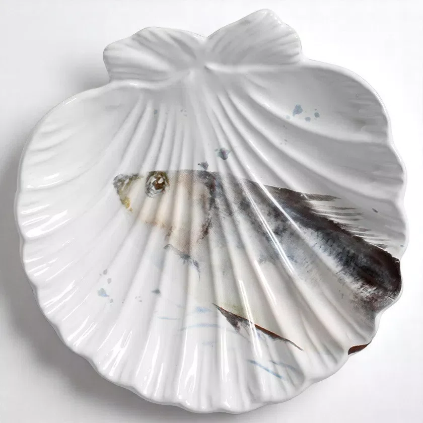 Confeccionados em cerâmica de alta qualidade, a peça se destaca pelo seu formato: trabalhada para simular uma concha marinha, enquanto o centro do prato é adornado com uma delicada estampa de peixe. A cor Branca confere versatilidade e realça o tema marítimo e os detalhes do relevo.