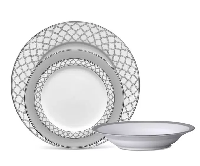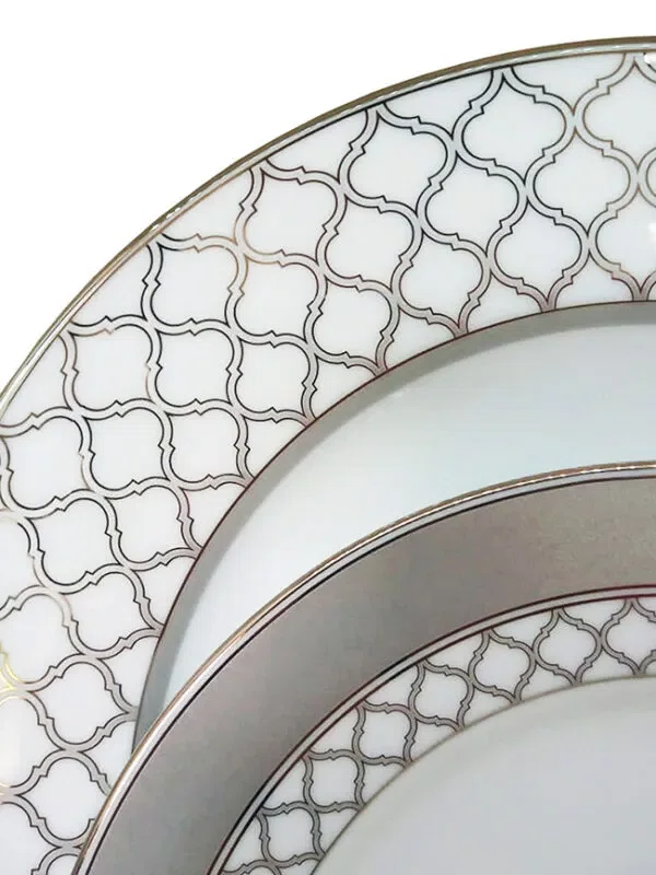 O Jogo de Jantar Eternal Palace 1717 da Noritake é uma celebração da sofisticação atemporal. Inspirado nos padrões intrincados e na geometria do icônico Palais Royal em Paris, este conjunto apresenta um design ogival estilizado (estilo Moroccan Trellis) que harmoniza perfeitamente com tons de cinza prateado. Cada peça é confeccionada em porcelana branca de qualidade premium, finalizada com um luxuoso filete de platina aplicado com precisão artesanal. É a escolha definitiva para quem deseja transformar recepções formais em eventos memoráveis, unindo a herança clássica ao frescor do design contemporâneo.