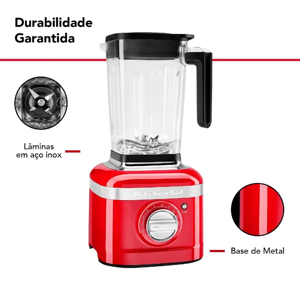 O Liquidificador KitchenAid Diamond é o aliado definitivo para quem busca resultados profissionais em casa. Com a icônica cor Empire Red, ele combina a estética clássica da marca com um sistema de trituração inteligente, capaz de lidar desde frutos congelados até as misturas mais densas, garantindo consistência e sabor em todas as suas preparações.