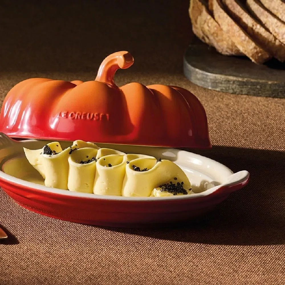 A Manteigueira Abóbora Le Creuset é uma peça icônica e funcional que transforma o armazenamento de manteiga em um elemento decorativo repleto de personalidade.