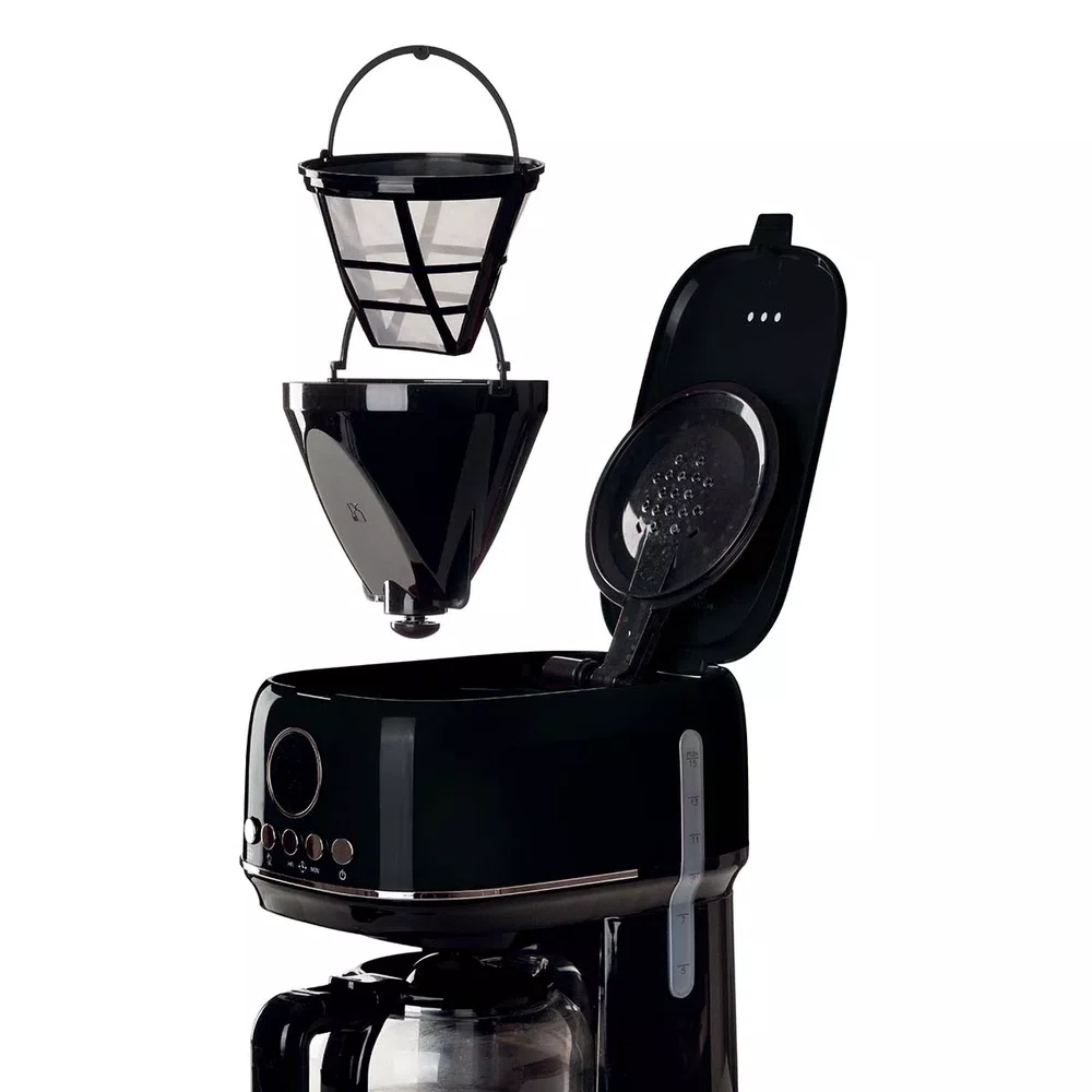 Filtros: Filtros removíveis e laváveis, dispensando o uso de filtros de papel e garantindo uma limpeza fácil e eficaz.