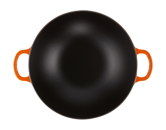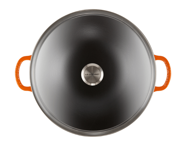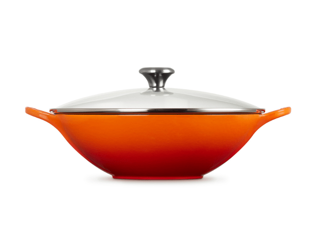O design asiático clássico da Panela Wok em ferro fundido da Le Creuset apresenta uma superfície de cozimento interior curva, lisa e contínua, ideal para refogar, saltear legumes e carnes grelhadas, e tem um peso perfeitamente equilibrado e uma base plana. A adição da tampa de vidro temperado bloqueia a umidade para cozimento a vapor. o esmalte interior acetinado preto desenvolve uma pátina natural que é praticamente antiaderente com o tempo. A superfície esmaltada colorida minimiza a colagem e manchas, não requer nenhum pré-tempero e é fácil de limpar.