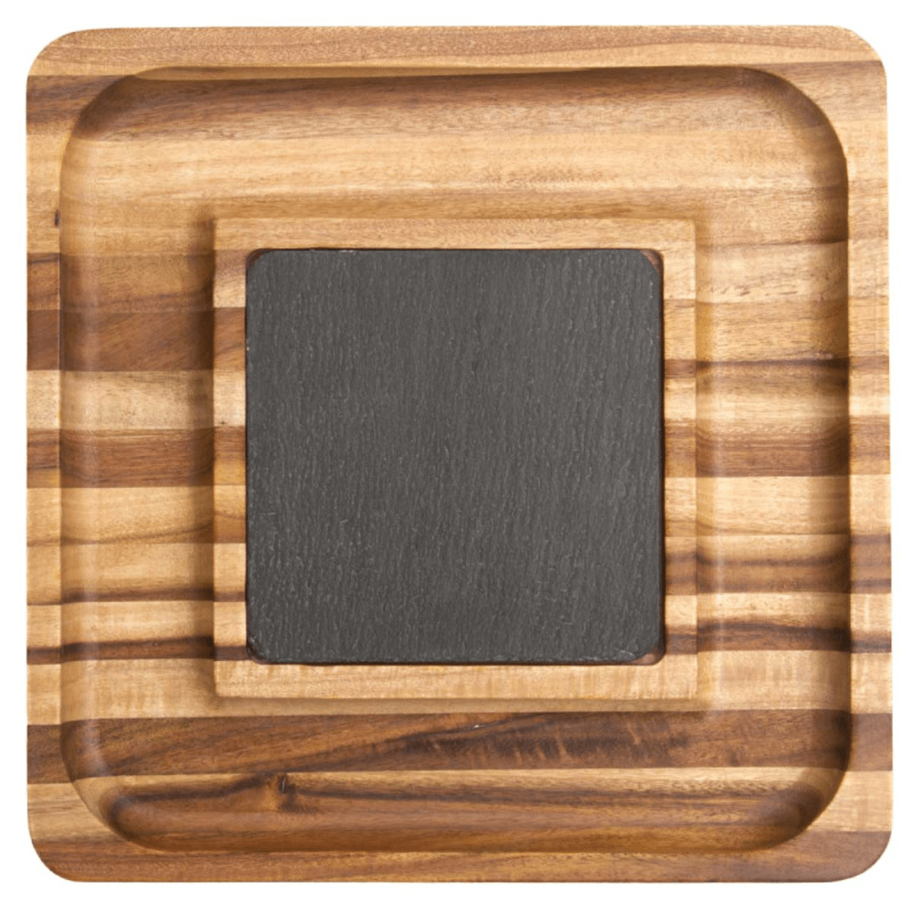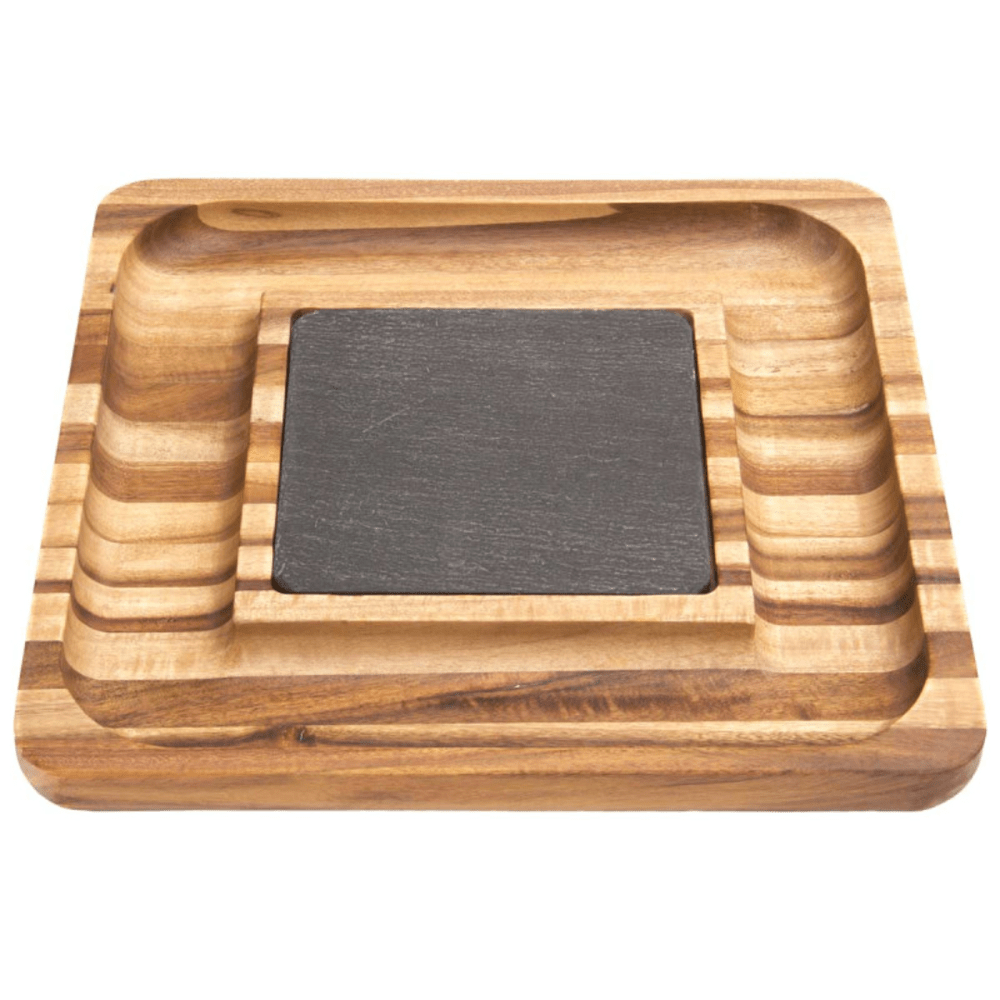 Essa linda peça é feita inteiramente em madeira acácia de reflorestamento, é uma madeira nobre e que confere mais beleza, elegância e um toque de modernidade a essa petisqueira. No centro, você encontra uma pedra confeccionada em ardósia, que é um material muito durável e de extrema qualidade.