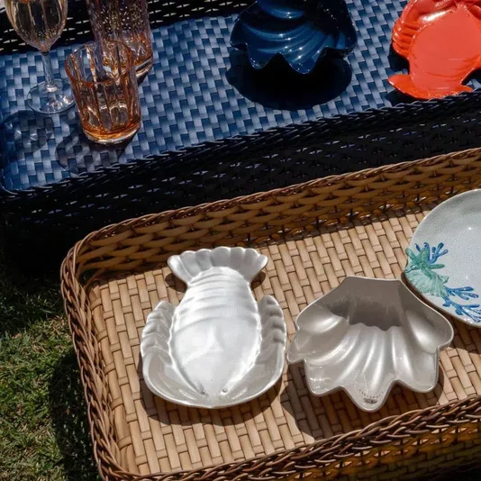 Este prato em formato de lagosta da Entrecasa é a tradução perfeita do "litoral chique". Com um design lúdico e sofisticado, ele foge do óbvio, trazendo a silhueta de uma lagosta esculpida com detalhes sutis em uma melamina branca. Por ser pequeno (24x15 cm), é ideal para servir entradinhas, canapés, sushis ou como uma petisqueira individual diferenciada. A cor branca permite que o alimento seja o protagonista, enquanto o formato inusitado desperta a curiosidade e o encantamento dos convidados.
