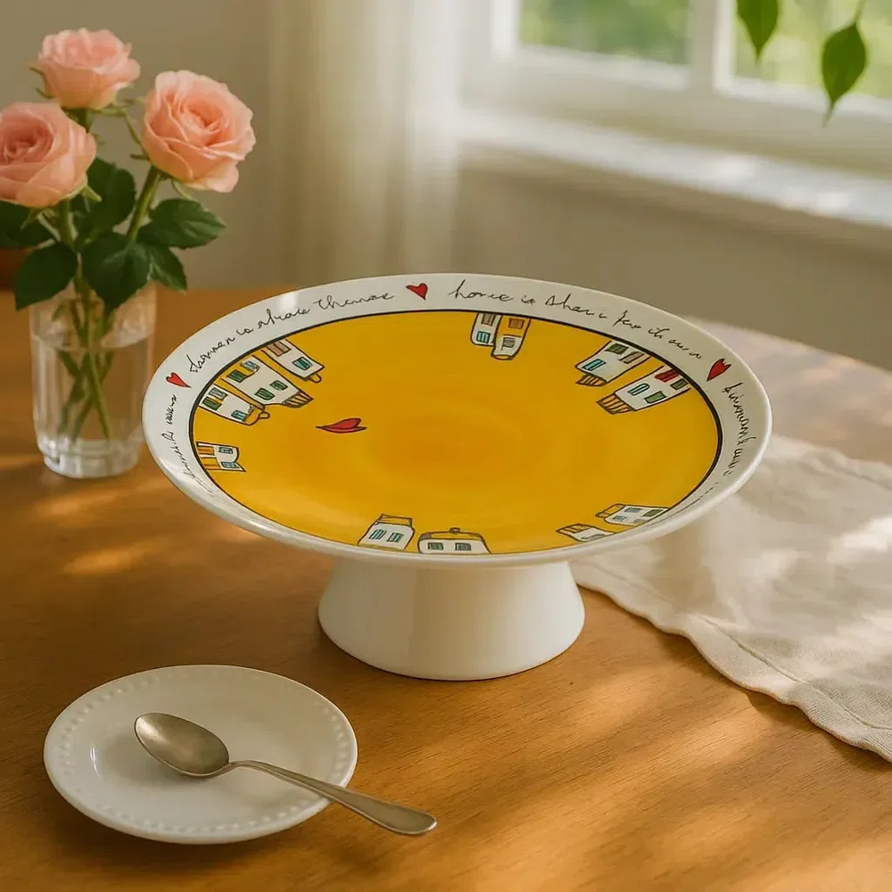 O Prato para Bolo com Pé Le Casette Amarelo transforma a apresentação de suas sobremesas em uma celebração encantadora do estilo rústico e artesanal italiano.