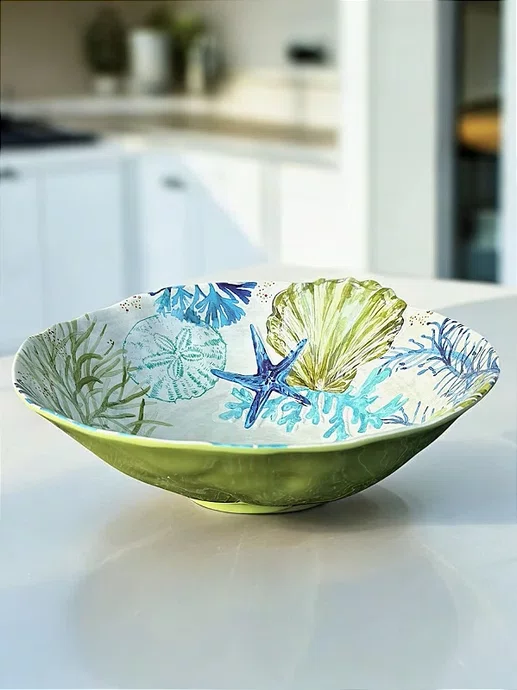 A Saladeira Estrela do Mar da Entrecasa é a escolha perfeita para quem deseja levar a atmosfera relaxante do litoral para a mesa. Com uma estampa de estrela do mar — em tons de verde, azul sobre o fundo areia — esta peça une o frescor do tema náutico à durabilidade incomparável da melamina. É o item ideal para servir saladas frescas, massas ou acompanhamentos em churrascos, almoços de verão e, claro, na casa de praia.
