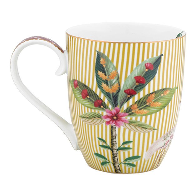 O Conjunto de 2 Canecas Extra Grandes La Majorelle Amarelo da Pip Studio é a escolha definitiva para quem busca conforto sem abrir mão do design de alta gama. Com uma capacidade robusta, estas canecas são ideais para quem aprecia porções generosas de chá, café com leite ou chocolate quente. O fundo amarelo vibrante serve como palco para a icônica estampa da coleção, que apresenta palmeiras estilizadas, flores exóticas e garças-reais, evocando o frescor dos jardins botânicos. Cada peça é finalizada com o característico filete de ouro de 24 quilates e os detalhes em listras e poás que conferem o acabamento luxuoso e artesanal da marca holandesa.