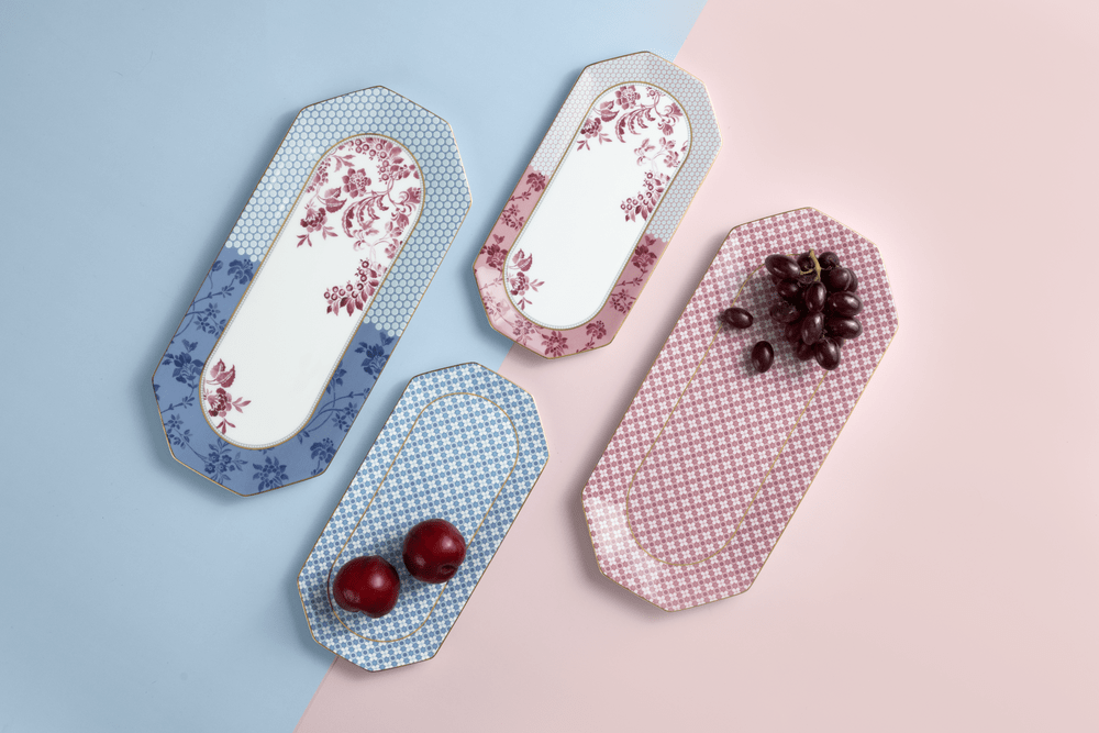 Uma peça de design singular que une o formato hexagonal contemporâneo à delicadeza floral da padronagem damasco, elevando o serviço de mesa a uma obra de arte.
