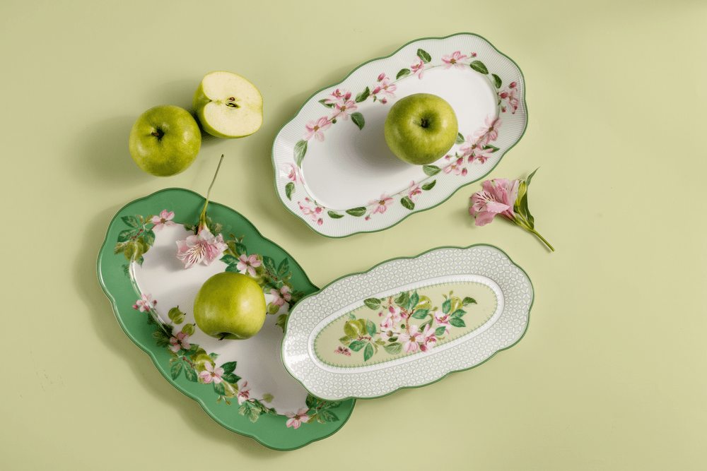 Uma peça imponente que combina a generosidade das formas oblongas com o frescor botânico da coleção Horticool, ideal para servir com distinção.