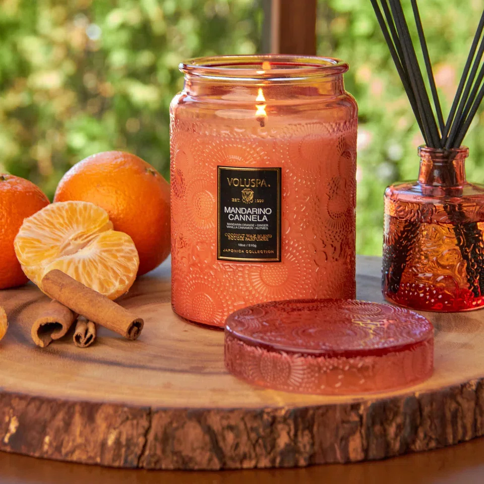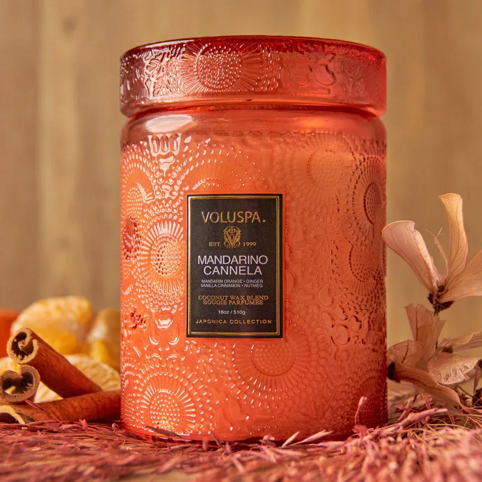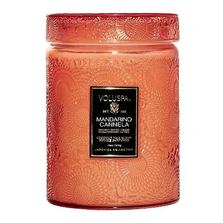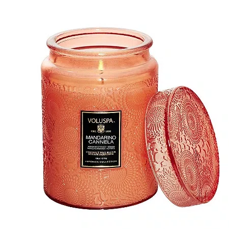 A Vela Mandarino Cannela da Voluspa é um clássico absoluto da marca. Apresentada no suntuoso formato Large Jar, esta vela se destaca pela sua presença física imponente e pela tampa de vidro decorada que sela a fragrância com perfeição. O aroma é uma mistura viciante que aquece o ambiente, tornando-a a escolha favorita para quem busca conforto e sofisticação em qualquer estação do ano.