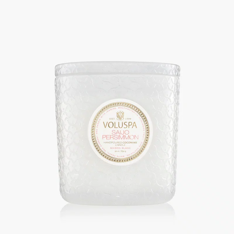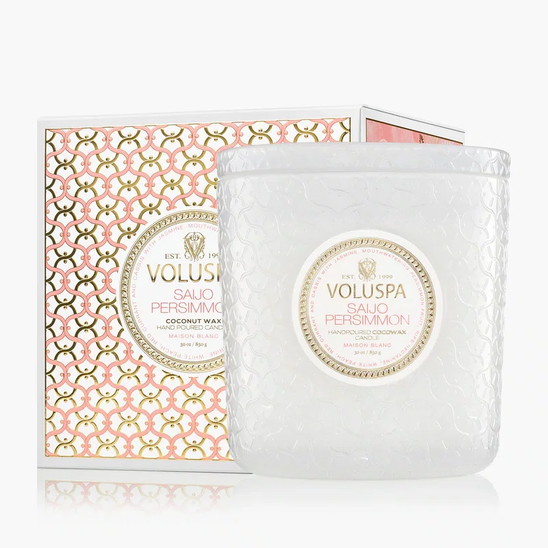 A Vela Voluspa Saijo Persimmon Luxe Jar é uma celebração vibrante e sofisticada, apresentada em um frasco de vidro de grandes dimensões que reflete a luz de maneira espetacular através de seu relevo clássico.