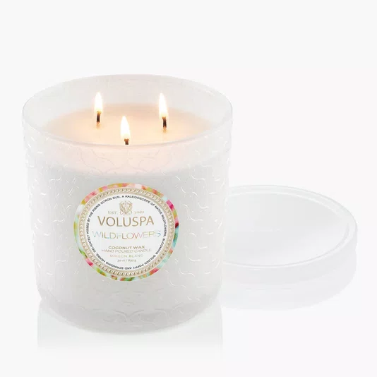 Para ambientes amplos, como salas de estar ou halls de entrada, a vela Luxe é a escolha ideal pela sua alta capacidade de perfumação. Certifique-se sempre de aparar os dois pavios (aprox. 0,6 cm) antes de cada utilização para evitar fumo e manter a chama estável. A fragrância Wildflowers é perfeita para criar um ambiente alegre e acolhedor durante o dia.